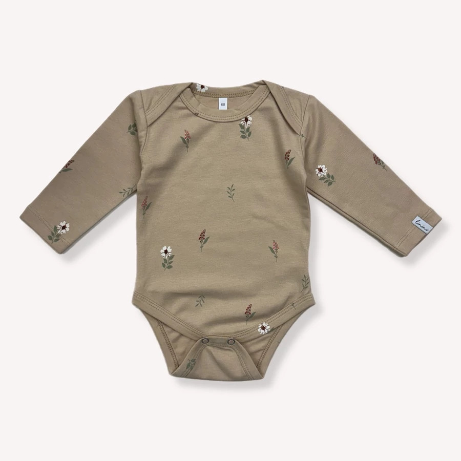 Vállán átlapolós, hosszú ujjú linini body világos homokszín alapon gyönyörű virágokkal díszítve.