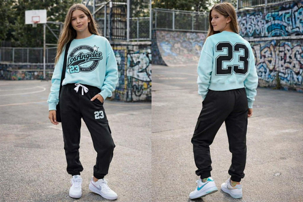 Lány Pamut együttes, gumis derekú nadrág és pamut lezser pulóver