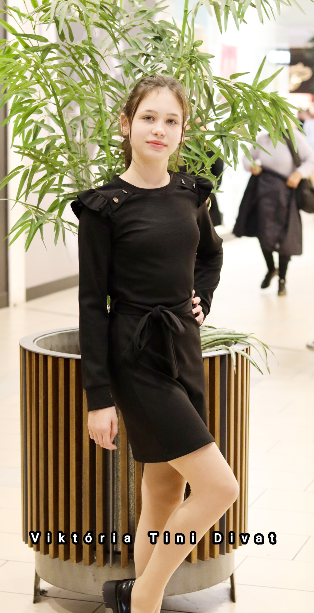 Lány fekete ruha gombokkal díszített