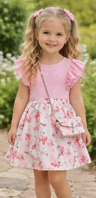 Lányka rózsaszín lepkés fodros ruha táskával
